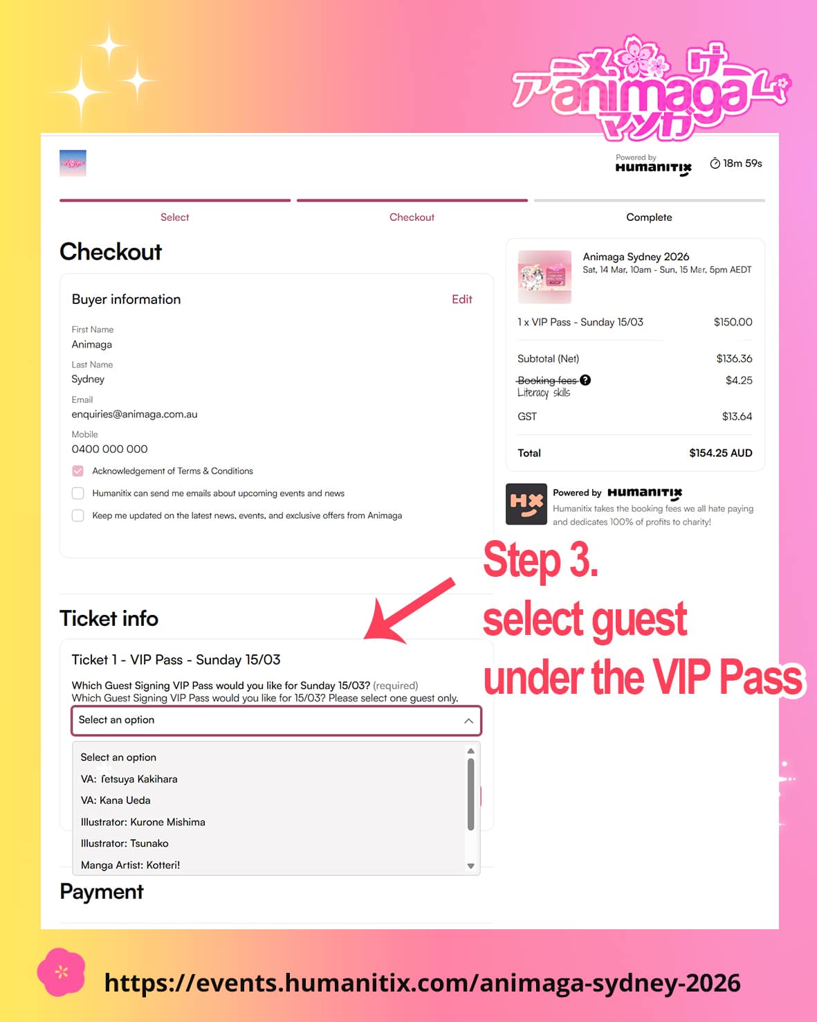 How do I choose my guest for the signing token? During the checkout process on Humanitix, you will see a dropdown menu. You must select your preferred guest (Voice Actor, Illustrator, or Cosplayer) at that time. Due to strict scheduling, these selections cannot be changed after the purchase is complete.